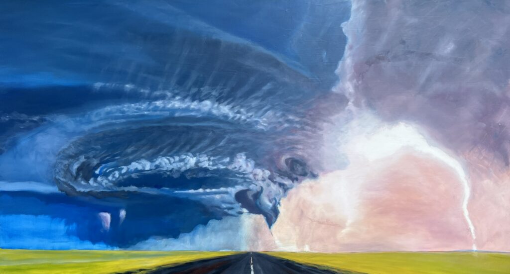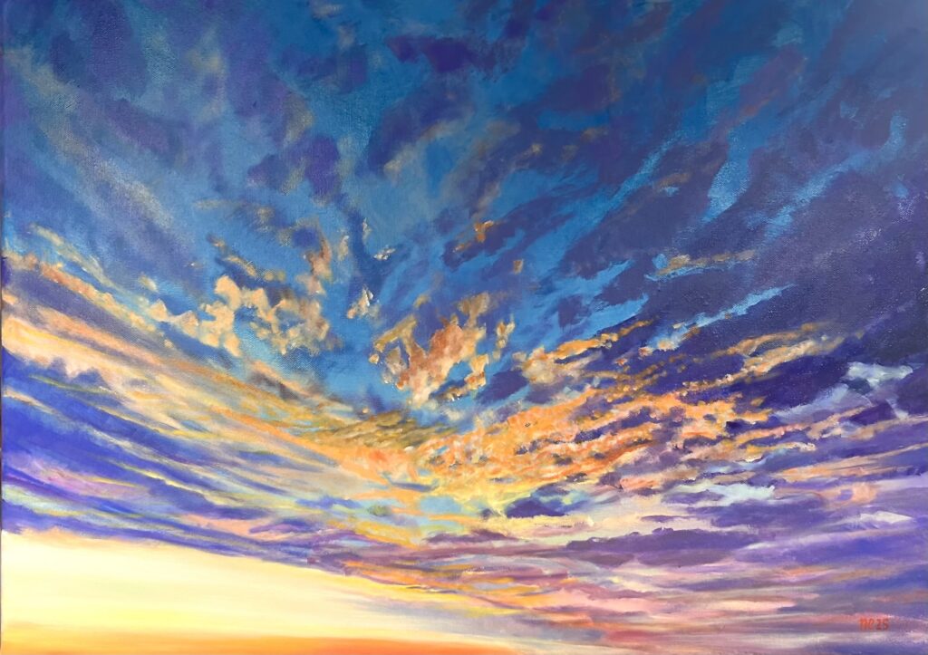Mein bisher größtes Bild 100×100! Ich finde es leichter und attraktiver, große Leinwände zu bemalen. Aber wo hängt man sie am Ende auf? Himmel und Wolken und Licht haben eine hohe Anziehungskraft für mich. Das Motiv für dieses Bild ist der Blick vom Augustabad über den Tollensee. Dort gibt es spektakuläre Sonnenuntergänge.